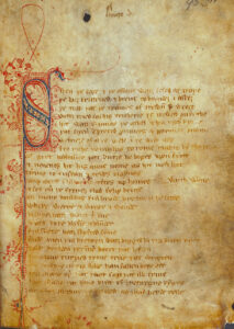 “On Christmas Eve, the king sat on his throne with his entire entourage, each in their own place. The people were cheerful and in a good mood because the king was particularly happy. When the people had been drinking for a while, a man walked into the hall. He was big and evil looking, his skin was pale and his eyes unsteady, his beard black and his nose long. This man had a helmet on his head, he wore chain mail and was girded with a sword. He had a gold necklace around his neck and a thick gold ring on his arm. He walked quickly into the hall and to the king’s throne. He did not greet anyone. The people were struck by the sight, but no one spoke to him.